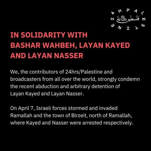 En solidaridad con Bashar Wahbeh, Layan Kayed y Layan Nasser Nosotrxs, lxs colaboradorxs de 24hrs/Palestina, locutorxs de todo el mundo, condenamos categóricamente el reciente secuestro y detención arbitraria de Layan Kayed y Layan Nasser. El 7 de abril, las fuerzas israelíes asaltaron e invadieron Ramallah y la ciudad de Birzeit, […]