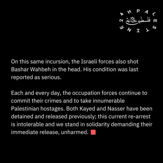 Todos los días, las fuerzas israelíes continúan ejecutando crímenes y tomando innumerables rehenes palestinos. Tanto Kayed como Nasser han sido detenidos y liberados anteriormente. Este nuevo arresto es intolerable y nos solidarizamos exigiendo que sean liberados de inmediato, e ilesos.