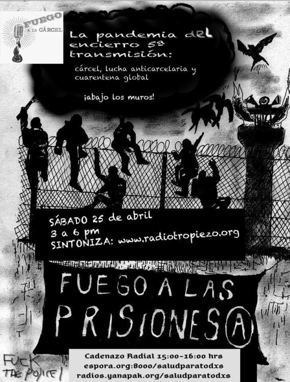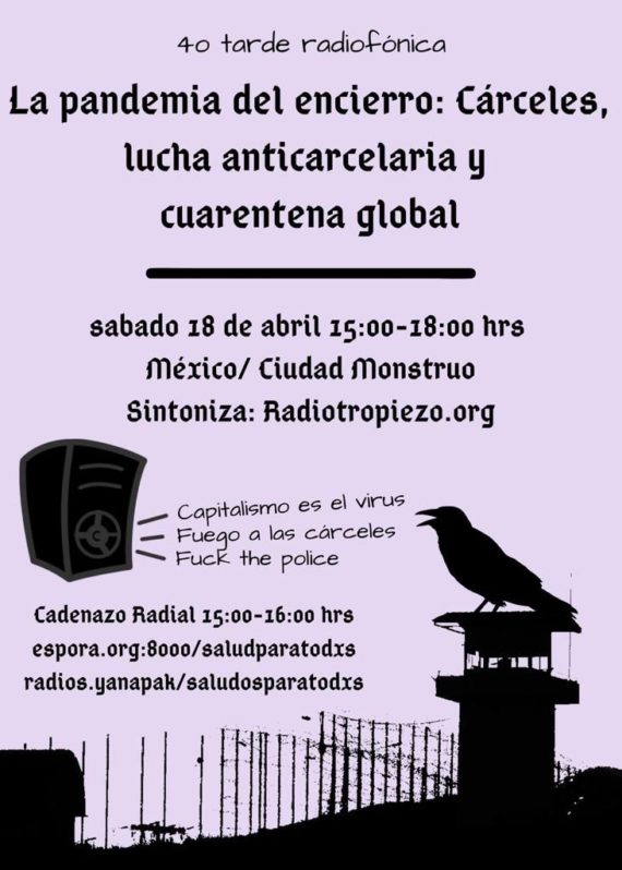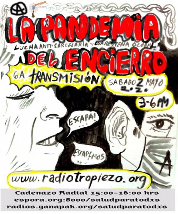 Primera parte: LA PANDEMIA DEL ENCIERRO: Reflexiones anarquistas sobre la prisión y la lucha anticarcelaria. Para más información, ir al sitio de NOTICIAS DE ABAJO. Segunda parte: FIEBRE INDUSTRIAL: Montaje sonoro en tiempo de virus. Compartiendo el aire. (Con audios de compas de Amilcingo, Peyo, desde Venecia, Malika, de Kyrguistan, […]